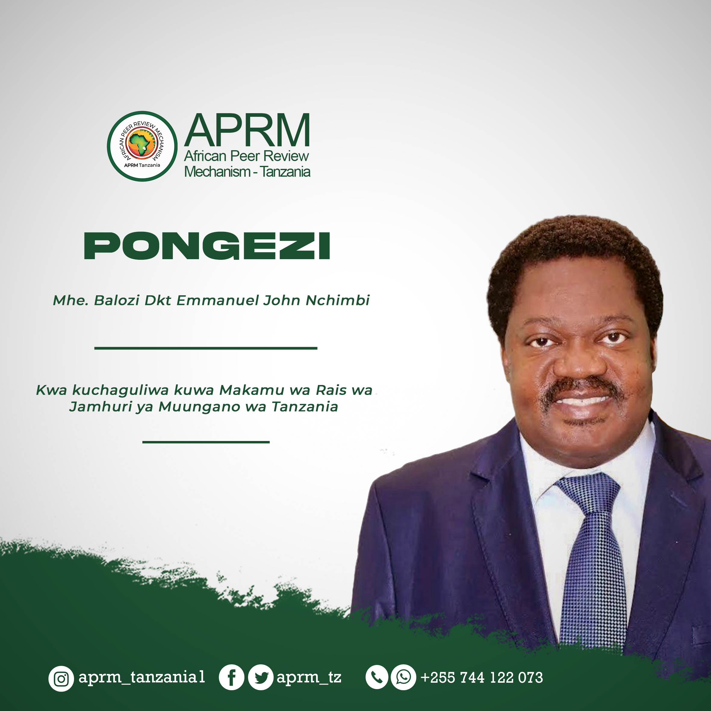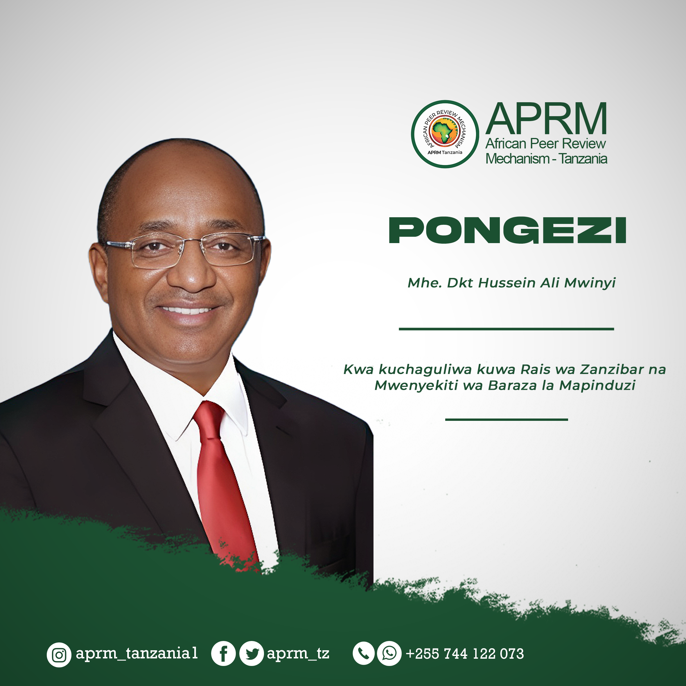 APRM Tanzania inatoa pongezi kwa Mhe. Dkt Samia Suluhu Hassan kwa kuchaguliwa kuwa Rais wa Jamhuri ya Muungano wa Tanzania, Mhe. Balozi Dkt Emmanuel John Nchimbi kwa kuchaguliwa kuwa Makamu wa Rais wa Jamhuri ya Muungano wa Tanzania na Mhe. Dkt Hussein Ali Mwinyi kwa kuchaguliwa kuwa Rais wa Zanzibar na Mwenyekiti wa Baraza la mapinduzi.